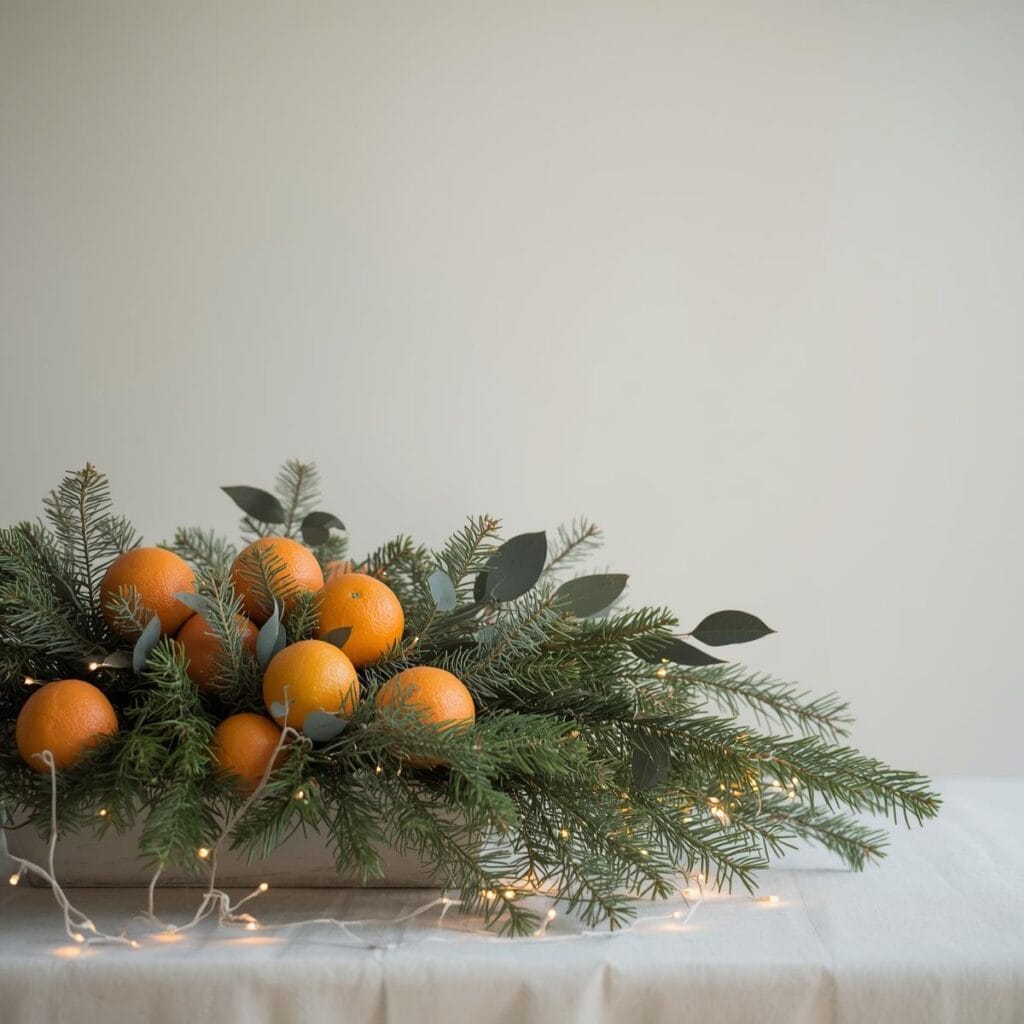 - Darauf Tannenzweige, Zapfen, Zimtstangen und getrocknete Orangen legen. Diese Kombination aus Farben und Texturen bringt die Natur ins Haus und sorgt für einen ansprechenden visuellen Effekt.