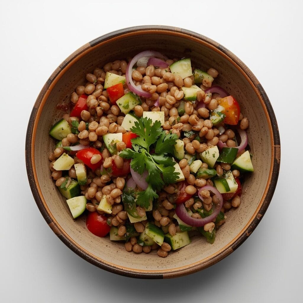 Der kalte Linsensalat bietet eine sättigende, aber leichte Alternative. Linsen werden mit Frühlingszwiebeln, Paprika und frischen Kräutern kombiniert und mit einer aromatischen Zitronen-Vinaigrette abgeschmeckt – perfekt für eine ausgewogene Mahlzeit.