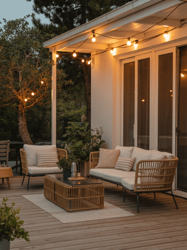 Wähle wetterfeste Möbel, die du liebst – Rattan, Holz oder Metall in Naturtönen.