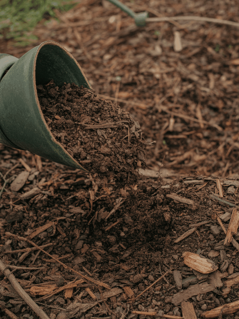 Verteile Kompost, Laub oder Mulch auf leeren Beeten. Das schützt und nährt den Boden.