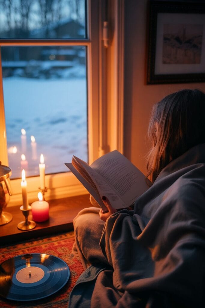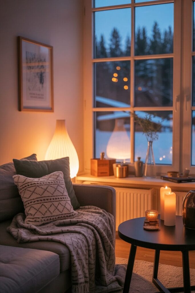 Richte dir eine persönliche Winter-Oase ein: Ein Ort nur für dich – mit Decke, Tee, Buch und warmem Licht.