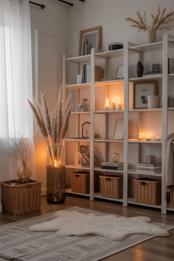 - Dekorieren mit dem, was du hast: Bücherstapel, Körbe, Lichterketten.