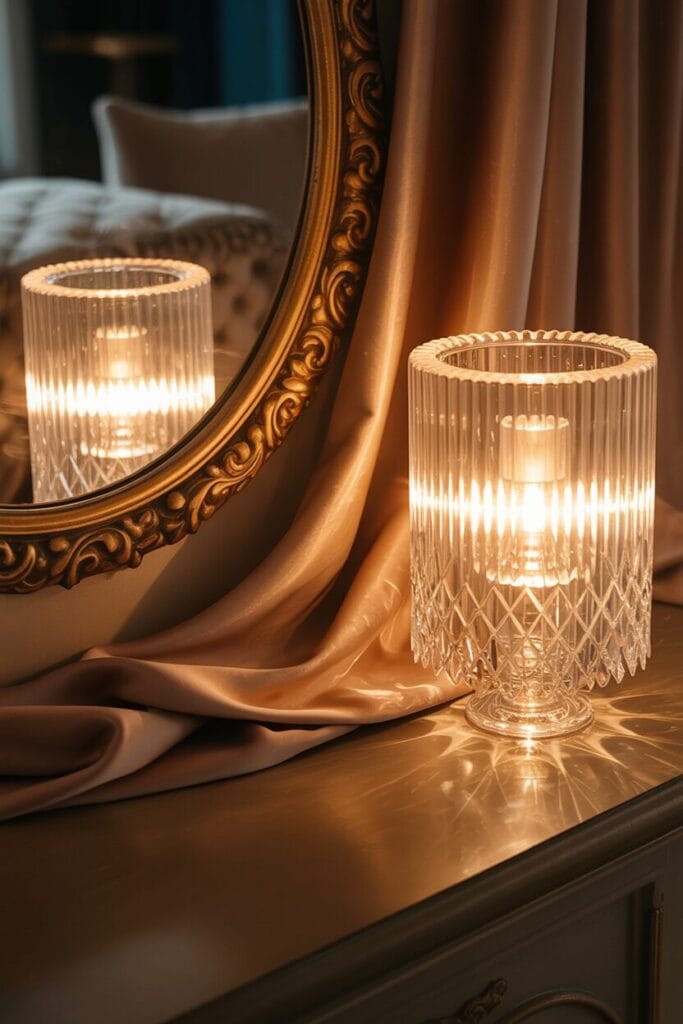 Warmweißes Licht (2700 K), goldene Lampen oder Kristalllüster.