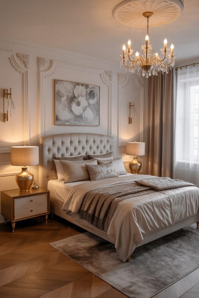 Ein Glamour-Schlafzimmer wirkt wie ein Boutique-Hotel: ruhig, glänzend, luxuriös.