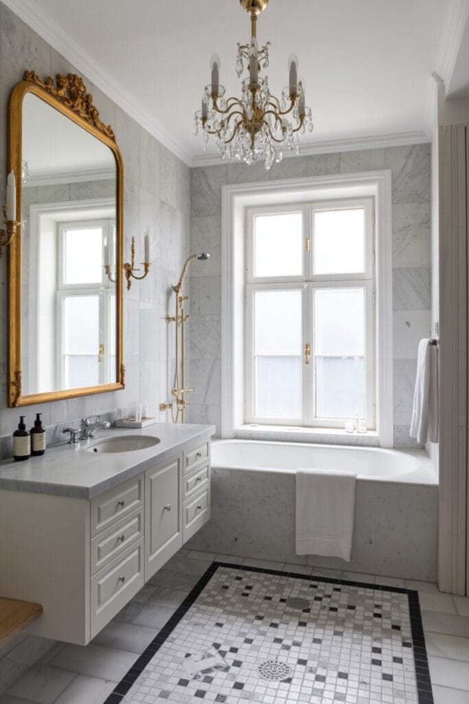 Wähle mattgoldene Armaturen, große Spiegel und duftende Pflegeprodukte.
