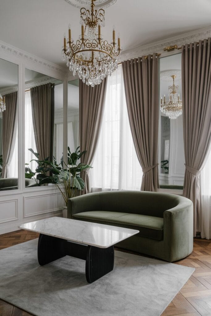 Er verzichtet auf Masse, setzt stattdessen auf ausgewählte Highlights: ein Statement-Spiegel, eine Samtcouch, ein Kristalllüster.