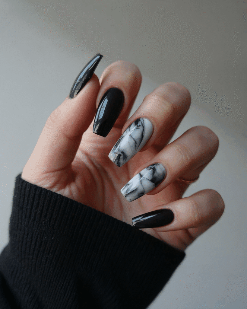 Schwarz-weiße Marble Nails mit Sarg-Form