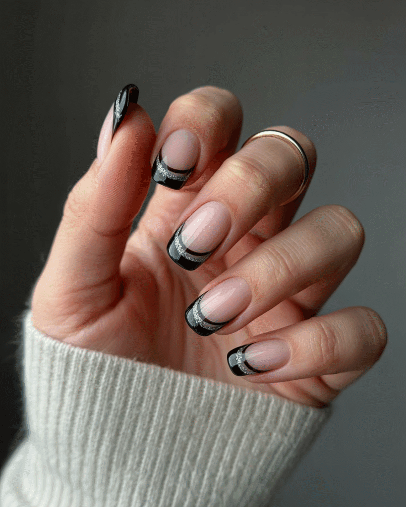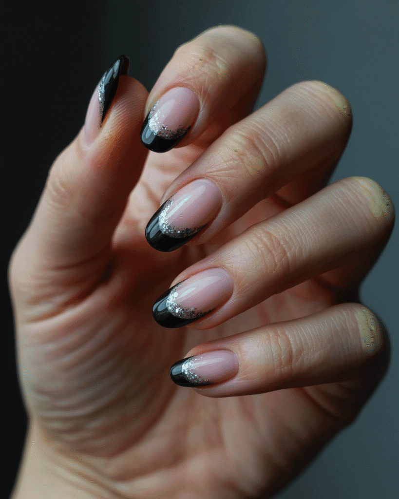 Schwarze French Nails mit Glitzer-Spitzen
