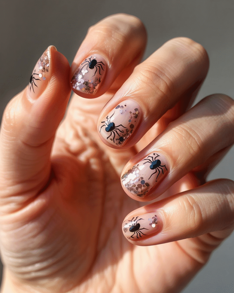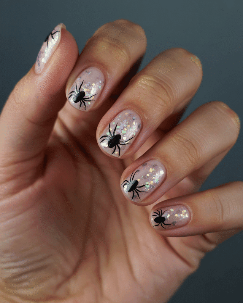 Spinnen auf Glitzernagel-Base