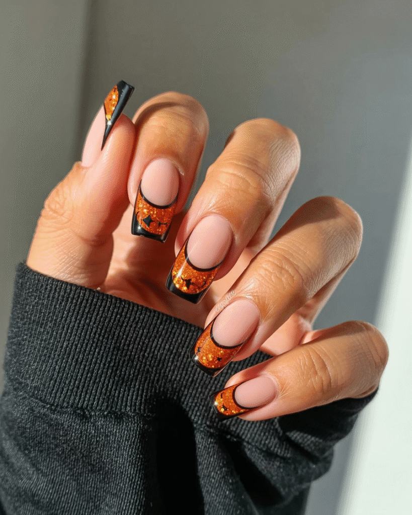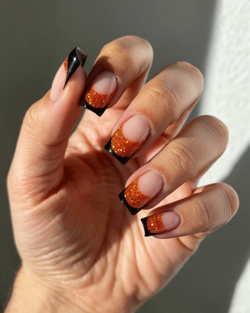 Orange-Glitzer French mit schwarzer Spitze