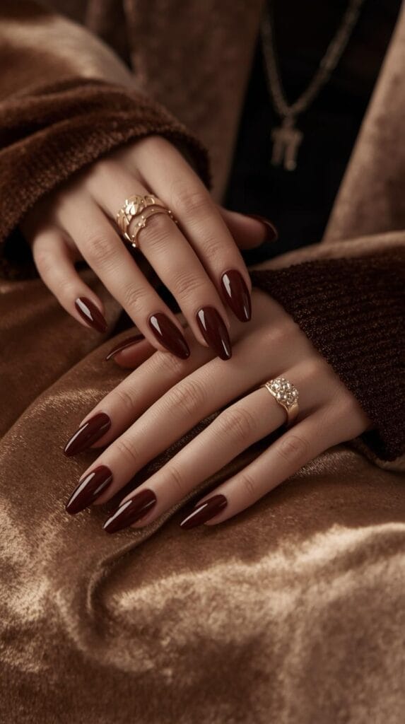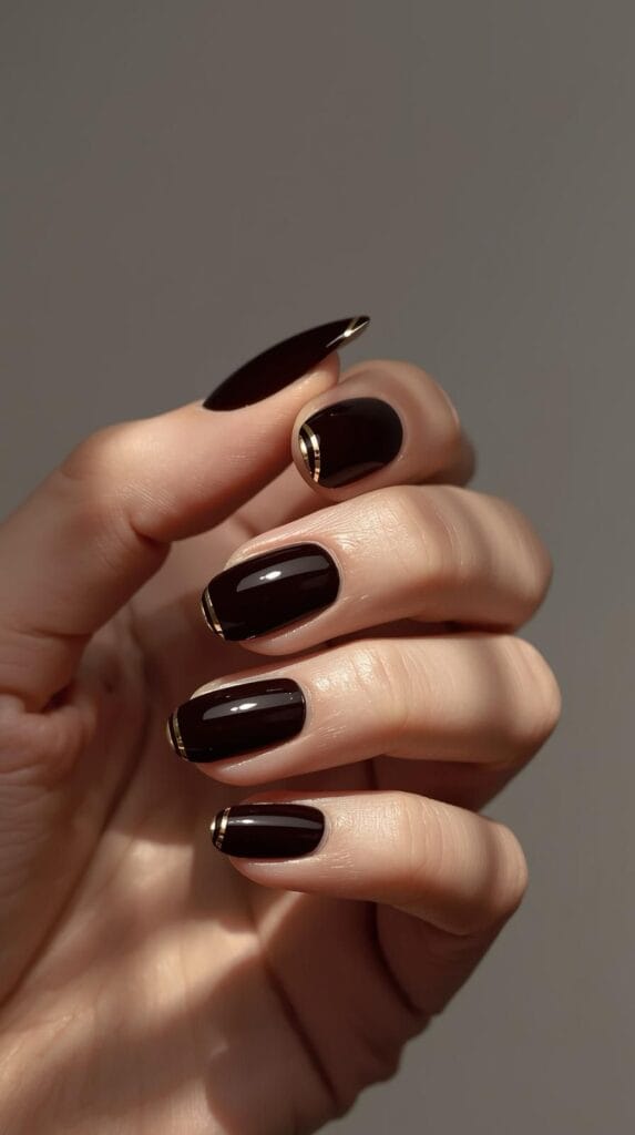 Dunkle Farben wirken am besten auf kurzen, ovalen oder mandelförmigen Nägeln – sie verlängern optisch die Finger und sehen besonders gepflegt aus.