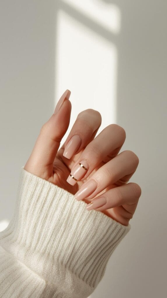 Wer es besonders elegant mag, kombiniert Nude-Nägel mit einem feinen Goldrand – schlicht und luxuriös zugleich.