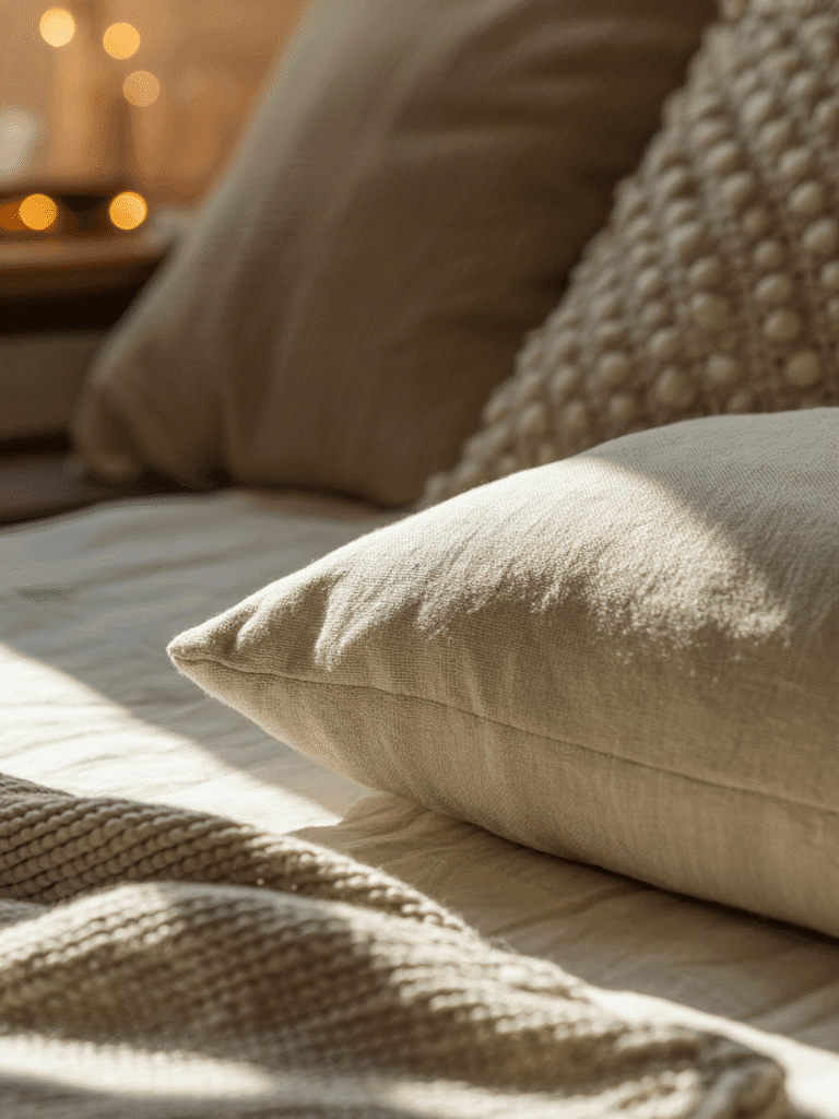 Wähle natürliche Materialien wie Wolle, Leinen oder Baumwolle – sie fühlen sich ehrlich und warm an.