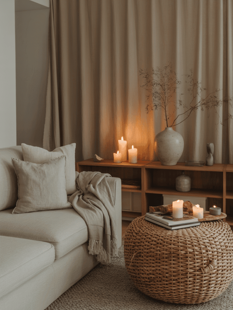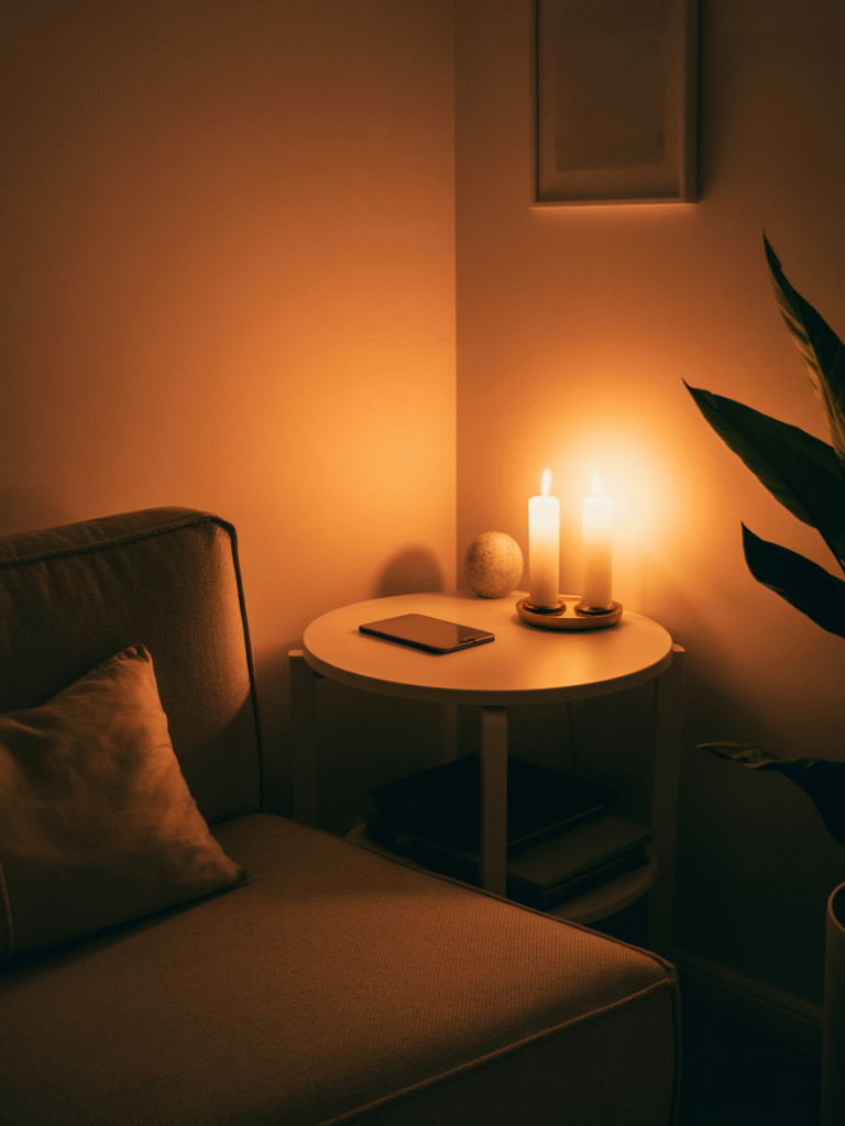 Kerzen, Lichterketten oder eine kleine Tischleuchte schaffen eine sanfte, geborgene Stimmung.