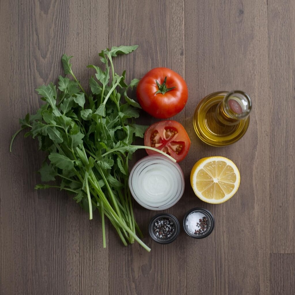 - Rucola waschen, Tomate und Zwiebel in feine Scheiben schneiden.